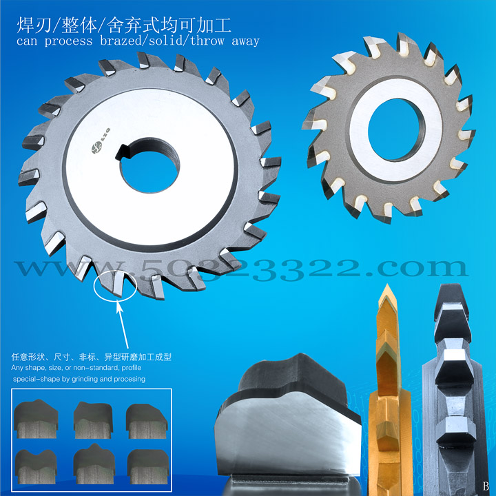 我司供应各种直齿形、圆弧形、交错齿形、高低齿形整体极超微粒钻石钨钢锯片铣刀、半圆键铣刀、T型槽铣刀、角度铣刀、高速钢切口铣刀、三面刃铣刀。广泛应用于眼镜配件、自行车零部件、钟表等各类轻工机械行业。具有切削效率快、耐磨性高、红硬性高的各种切削工具。厚度公差可控制在5μm,外径公差控制在0.03mm,侧面跳动5μm,表面粗糙度0.4μm,可多片组合,精密度好!