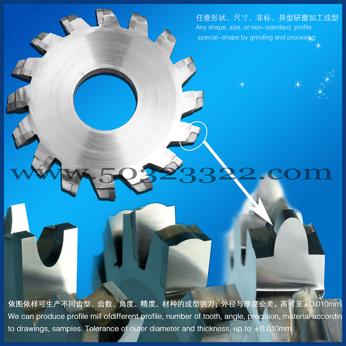 依图依样可生产不同齿型、齿数、角度、精度、材种的成型铣刀;外径与厚度公差,高可至±0.010mm。
