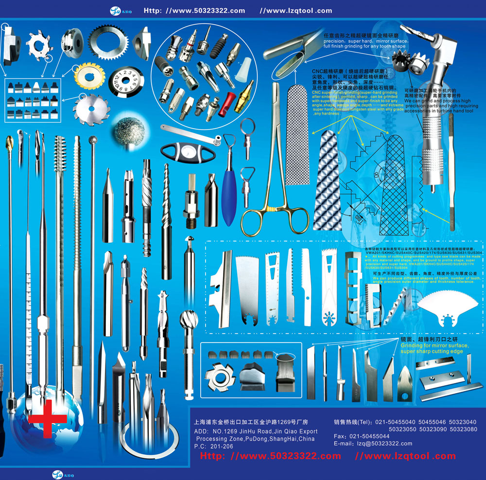 LZQ是一个优秀的高精密全精研磨医疗工具、刀具、冶具、零配件、特殊新产品的代工企业,目前主要为国际一流品牌的供应商做供应商代工,代工主要用户也均为医疗工具、冶具的制造企业。因为长期从事于飞机、舰艇、汽车等精密配件生产用的非标准工模具、成型冶具、不锈钢钨钢钎焊工夹具的生产加工,从而逐渐建立并不断完善先进综合的生产体系及各种精密技术生产加工能力,实现各类医疗工具、冶具配件产品的高精密、高度复杂、组合成型的几何加工,依图依样尺寸/公差/要求复合成型加工,可生产极为复杂、精密的形状。工具、刀具可以有分段标记、不同颜色的色圈、不同颜色的涂层、带内冷孔……要求,只要有要求即可实现。