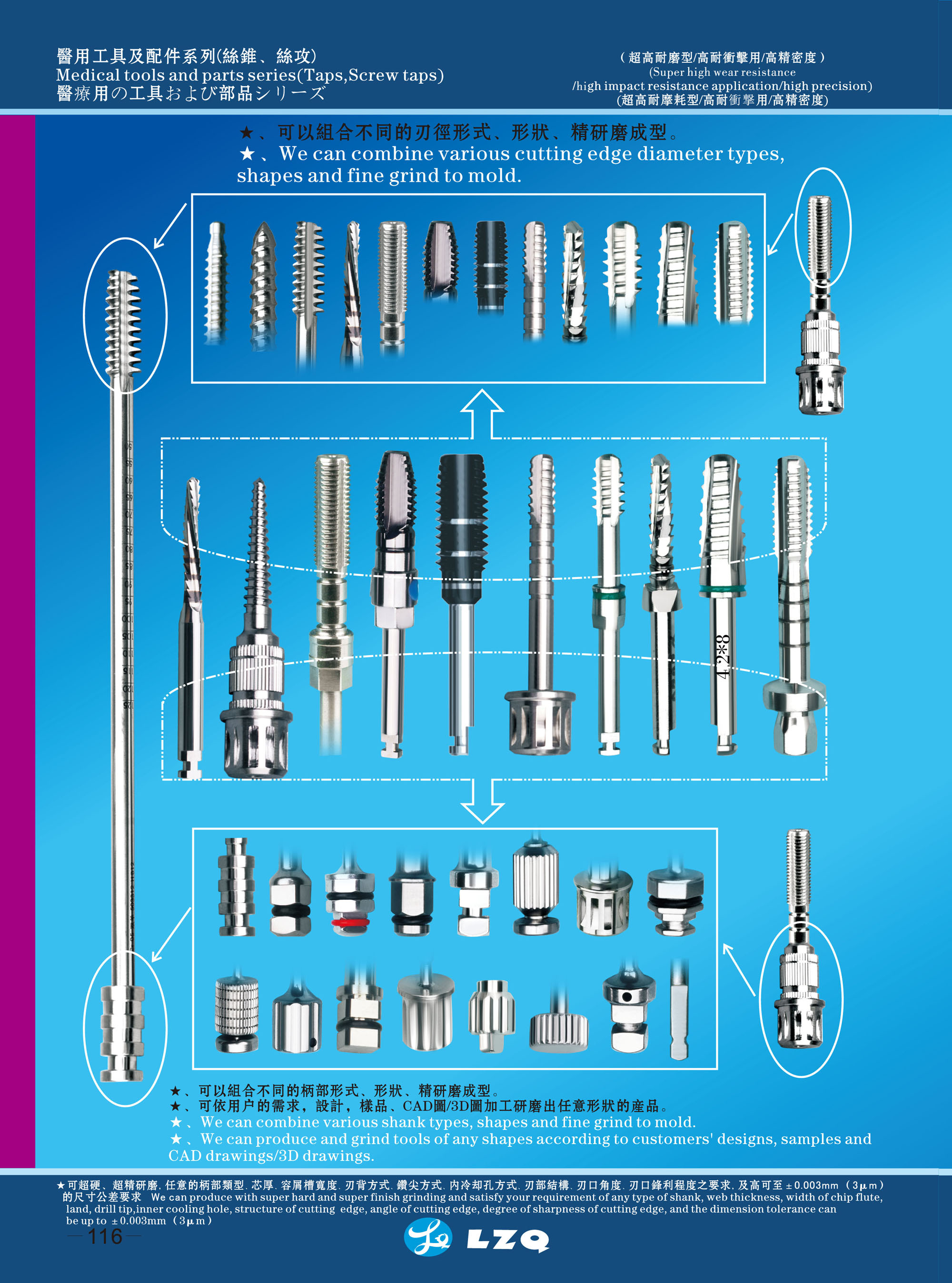 LZQ是一个优秀的高精密全精研磨医疗工具、刀具、冶具、零配件、特殊新产品的代工企业,目前主要为国际一流品牌的供应商做供应商代工,代工主要用户也均为医疗工具、冶具的制造企业。因为长期从事于飞机、舰艇、汽车等精密配件生产用的非标准工模具、成型冶具、不锈钢钨钢钎焊工夹具的生产加工,从而逐渐建立并不断完善先进综合的生产体系及各种精密技术生产加工能力,实现各类医疗工具、冶具配件产品的高精密、高度复杂、组合成型的几何加工,依图依样尺寸/公差/要求复合成型加工,可生产极为复杂、精密的形状。工具、刀具可以有分段标记、不同颜色的色圈、不同颜色的涂层、带内冷孔……要求,只要有要求即可实现。