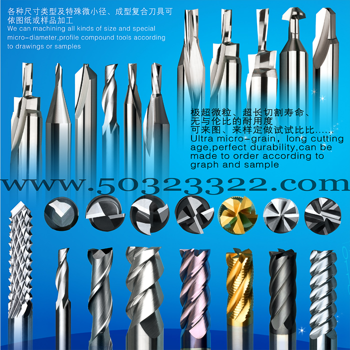刃径:(微小型)φ0.10 mm-φ53.00mm(整体钨钢)、φ20.00mm-φ80.00mm(焊刃式).