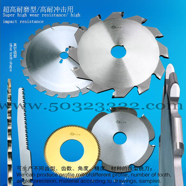 我司供应各种直齿形、圆弧形、交错齿形、高低齿形整体极超微粒钻石钨钢锯片铣刀、半圆键铣刀、T型槽铣刀、角度铣刀、高速钢切口铣刀、三面刃铣刀。广泛应用于眼镜配件、自行车零部件、钟表等各类轻工机械行业。具有切削效率快、耐磨性高、红硬性高的各种切削工具。厚度公差可控制在5μm,外径公差控制在0.03mm,侧面跳动5μm,表面粗糙度0.4μm,可多片组合,精密度好!